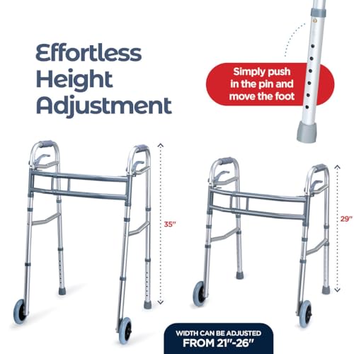 Walkers for Seniors Aluminum Lightweight Walker with Wheels Walker Adjustable Width and Height, Folding Walker with Arm Support Walker for Elderly Handicapped Disabled 2 Wheels in Front