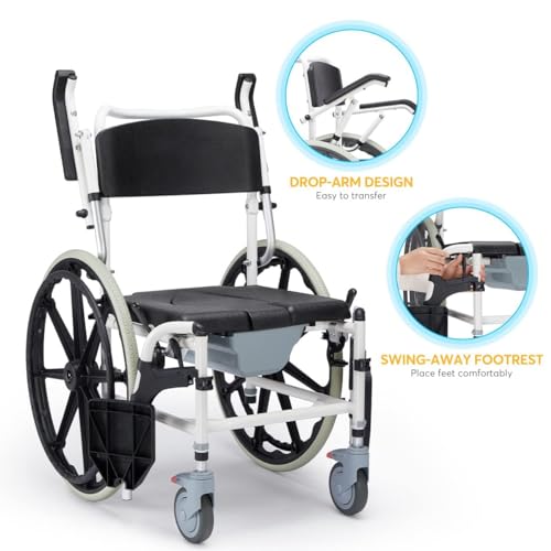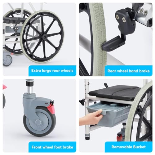 ENHANCED SELF-CARE WHEELCHAIR: This manual wheelchair is designed for effortless self-propulsion, featuring precision bearings and large wheels for smooth navigation. Its cut-out seat, complete with a removable lid and bucket, provides easy access for personal hygiene, facilitating a more convenient and independent shower experience.
