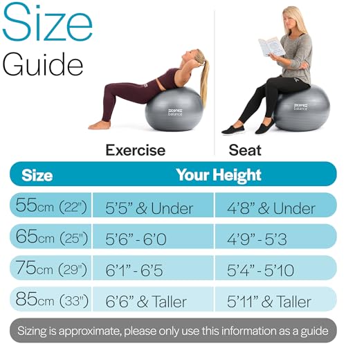 RANGE OF SIZES FOR A PERFECT WORKOUT: Core Balance Gym Balls come in a choice of sizes to suit your height and workout in comfort. Check out our size guide (image 5) to determine whether you need a 55cm, 65cm, 75cm, or 85cm ball. As an added bonus, each gym ball includes a pump and tape measure to easily inflate to the correct capacity.